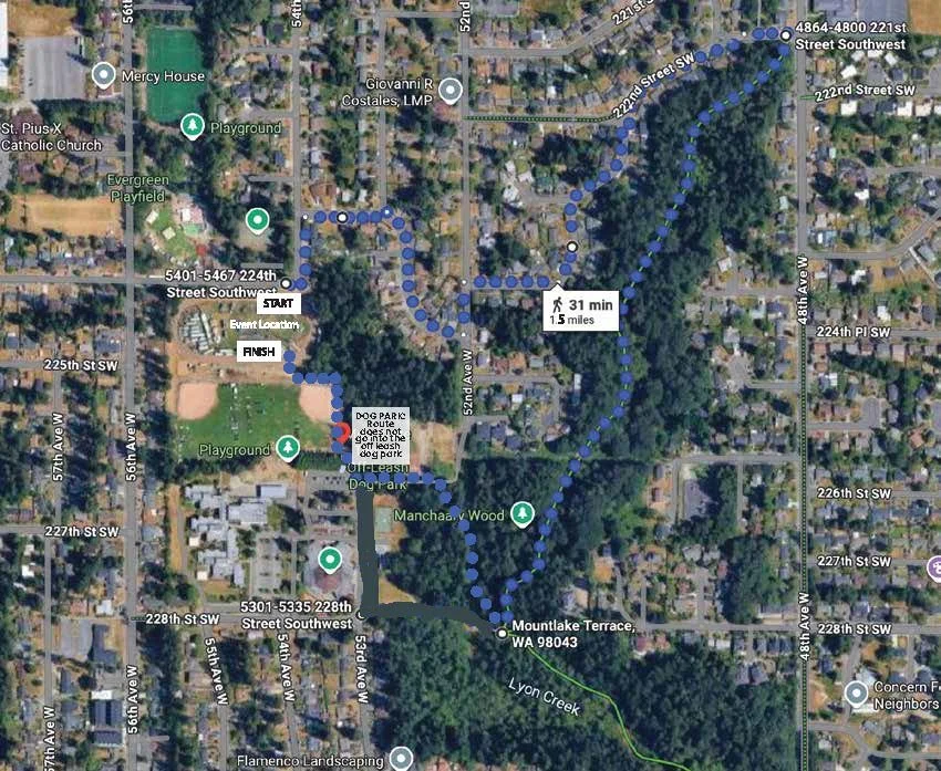 22205 56th Ave W, Mountlake Terrace 98043Distance: ~1.5 miles of cross-country trail walking with your dog